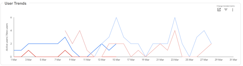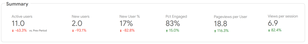 My KPI table is interested in two things: the website’s user base, and their engagement in its content. For the first, I track both total active users as well as the number of new users. Total active users gives us a sense of how the website is doing, but new users gives us some insight into where it’s going. Second, I track total views per active user and views per session. The idea of both is to get a sense of how “deep” or “shallow” user visits are. For example, does a user skim a single post and then leave (shallow), or do they view multiple posts (deep).